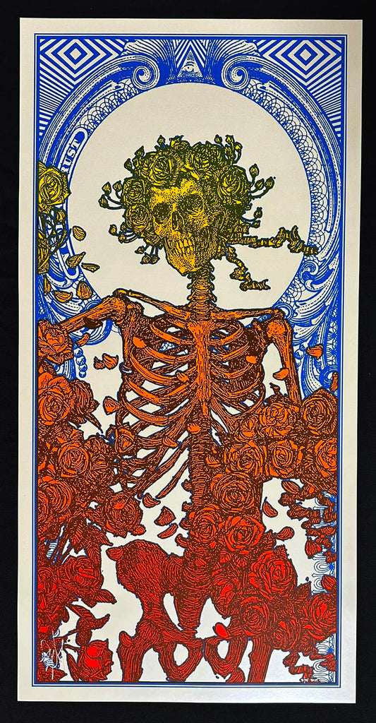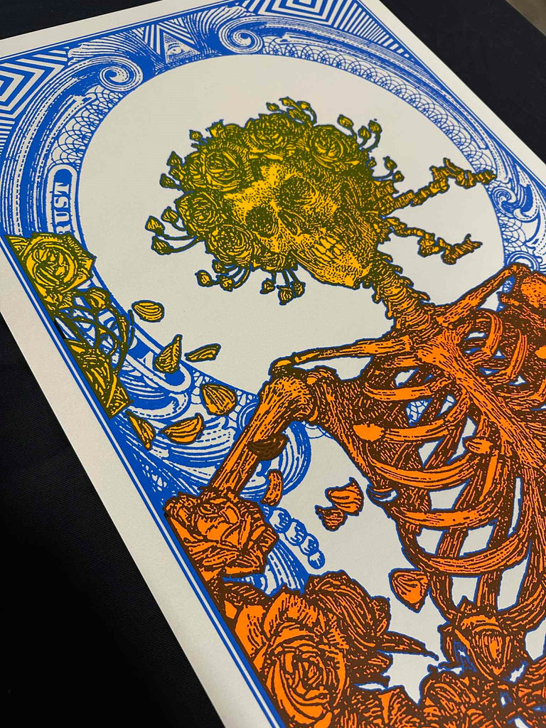 3 color, split fountain with black-light inks, screen print on pearlescent foil.